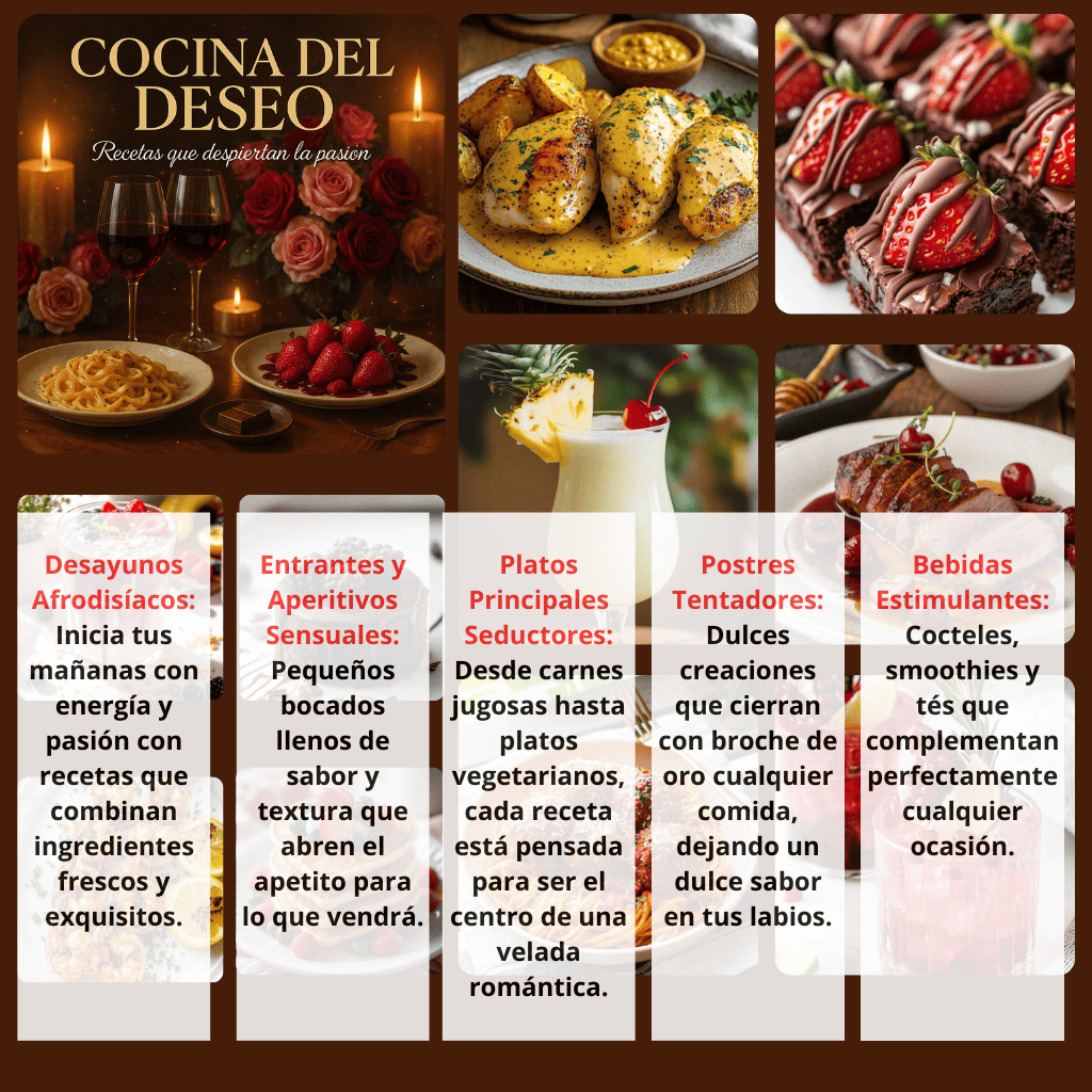 📕 Un recetario digital único con 50 recetas afrodisíacas cuidadosamente seleccionadas para sorprender, conquistar y encender los sentidos.